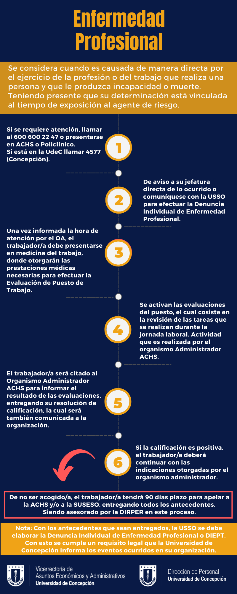 Se presenta el procedimiento a seguir cuando una afección de salud se asocia directamente al ejercicio de funciones laborales. Detalla los pasos para acceder a atención médica especializada, realizar la evaluación del puesto de trabajo y gestionar la denuncia correspondiente ante el organismo administrador.