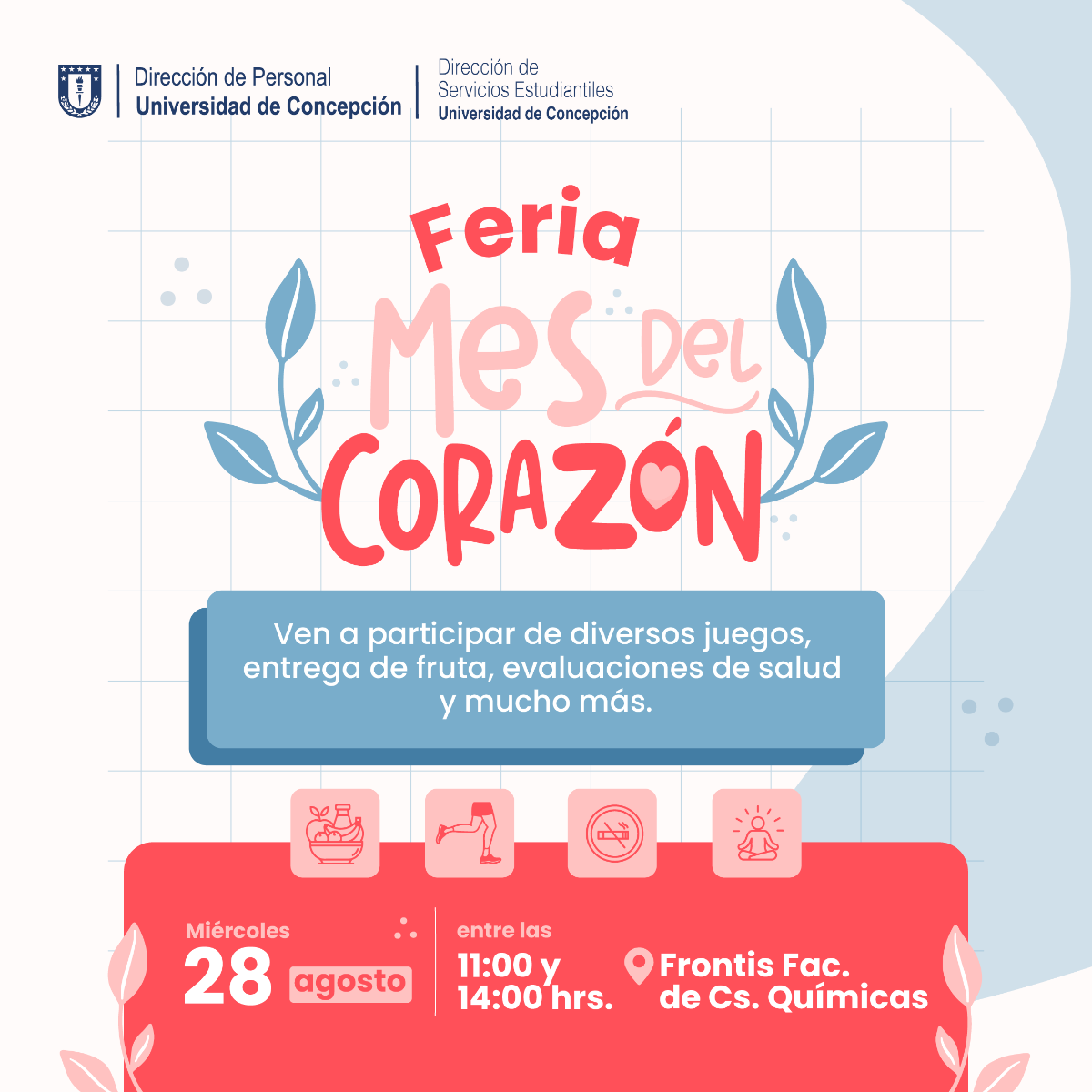 Un trabajo transversal a nivel universitario que dará cierre a las actividades con la ‘Feria Mes del Corazón’ que se desarrollará este miércoles 28 de agosto, entra las 11:00 y 14:00 horas, en el frontis de la Facultad de Ciencias Químicas del Campus Concepción.